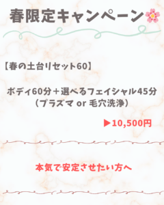 【期間限定】1/15〜2/28 キャンペーンのお知らせいつもご来店・ご覧いただきありがとうございます。この感じる季節、肌や体のメンテナンスをしたい方に向けて期間限定キャンペーンをご用意しました
